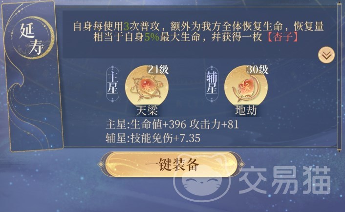 普攻群体回血,恢复量和自身攻击挂钩,同时获得1个“杏子”。董奉的技能不耗能,但需要至少有几个杏子才能用,每有1个杏子就可以给队友施加一层攻击力“延迟扣血”的buff,同时提升攻击力。作为队长可以提升全体阴阳属性抗性。
