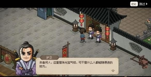 虽然护卫一开始不让主角进入珠光宝气楼,但当主角再次报上名号时,护卫还是选择了放行。进入珠光宝气楼后,遇到江湖人因为买到残品前来找茬,原来是碰瓷讹诈老板的恶棍;选择帮掌柜解围,会立即进入战斗。