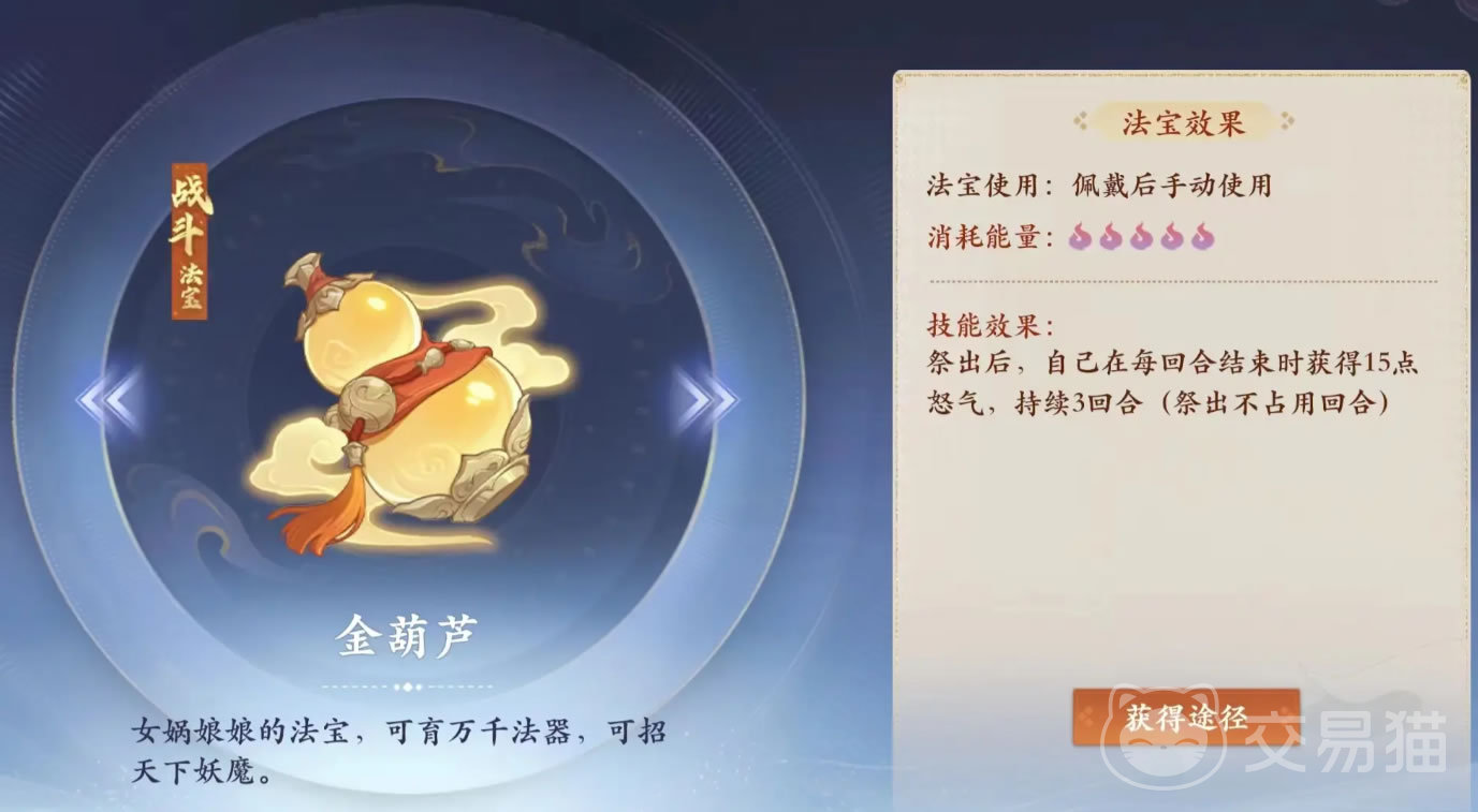在封神小说中拥有葫芦法宝的大仙有不少,比如斩仙飞刀就是陆压的法宝,而崇黑虎的葫芦中则装着一群铁嘴神鹰,女娲娘娘的葫芦则封印这招妖幡。这里游戏中的金葫芦,小编猜测可能原型是陆压的那个法宝葫芦。因为金葫芦的特效是在祭出后,自己每回合结束时额外获得15点怒气值,持续3回合。