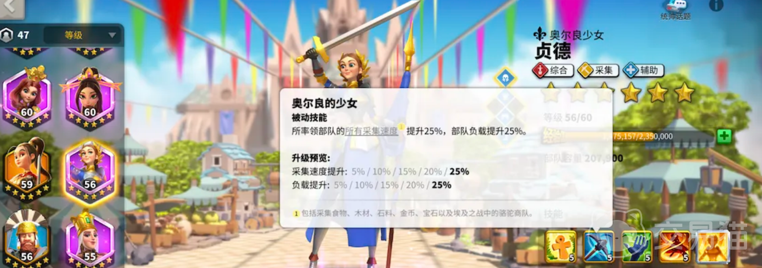 贞德这个武将也非常的不错,他在资源采集这方面能够增加25%的加成。他是一个十分全能的采集方面的武将,所以玩家如果不确定后续需要哪种资源,到时候建议用它来进行,可以能够大幅度地提高所有资源采集的加成,满足所有不同的需求。