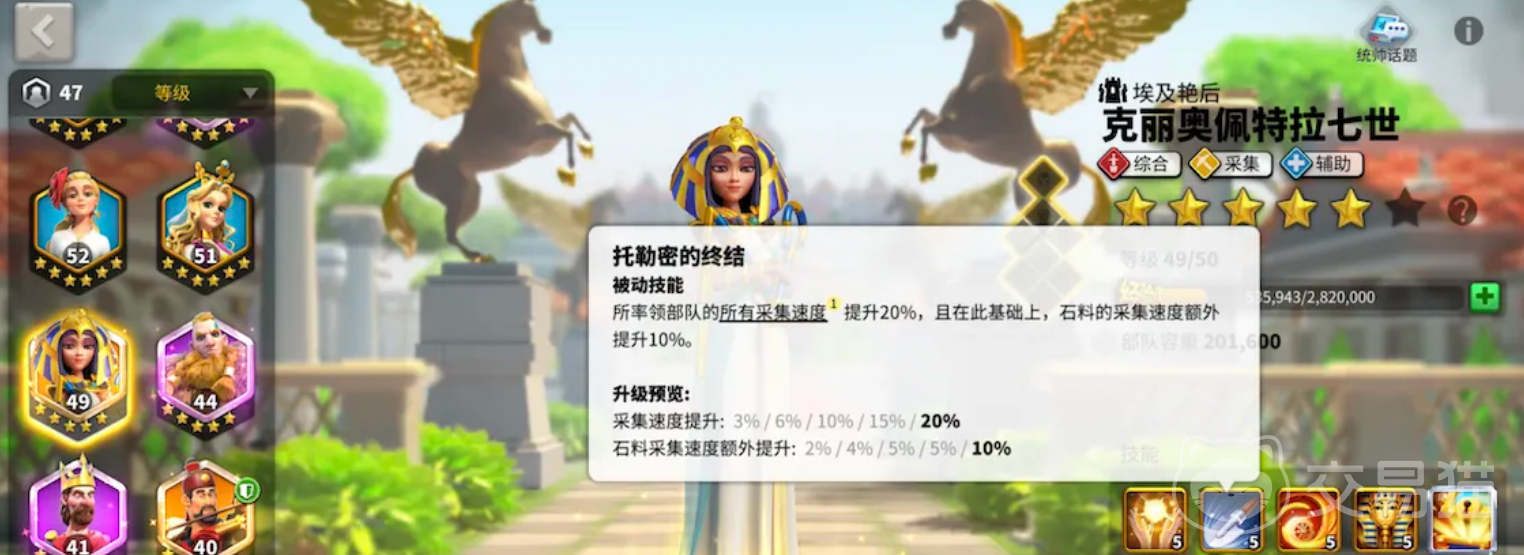 埃及艳后是小编第一个推荐给大家的副将,他也是采集类的武将,主要的是他采集石头这个资源的时候有30%的加成,在采集其他资源的时候有2%。10的加成是一个全面发展均衡采集能力的武将。所以在搭配上可以推荐他与百夫长进行搭配,能够有效的采集大量的石头资源。