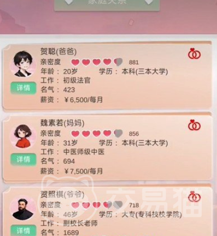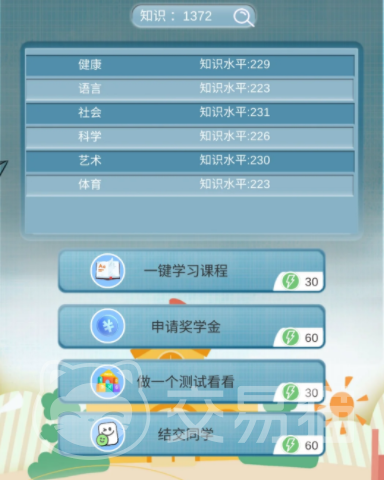 第四题是对于音乐类能力的考察,属于打击乐器的要选择快板,第五题需要回答教室的英文,答案为classroom,第六题是关于礼貌的问题,假如有别人在发言,能做的只有认真倾听,第七题要求玩家选择出成年人正确的体重,选择120~180之间。从幼儿园开始每一年都会有考试,这些考试不会像现实生活中一样区分大量的科目和类别,在游戏里基本上一场考试就已经包含了所有的学科和类目,高考在游戏里也不再是完全改变人生的机会,只要去提升人物的各项天赋以及数值,在毕业之后依旧会有大量的工作可以选择。