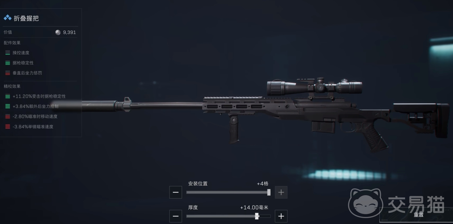 然后说下握把。握把有两个参数,分别是厚度和配重。配重影响的是后坐力和瞄准速度。小编推荐新人玩家无脑拉满配重,毕竟配重拉满可以减少开枪时的后坐力,武器用起来会很舒服,不会太飘。至于厚度,玩家可调可不调,可以直接选择默认数据,没什么影响。