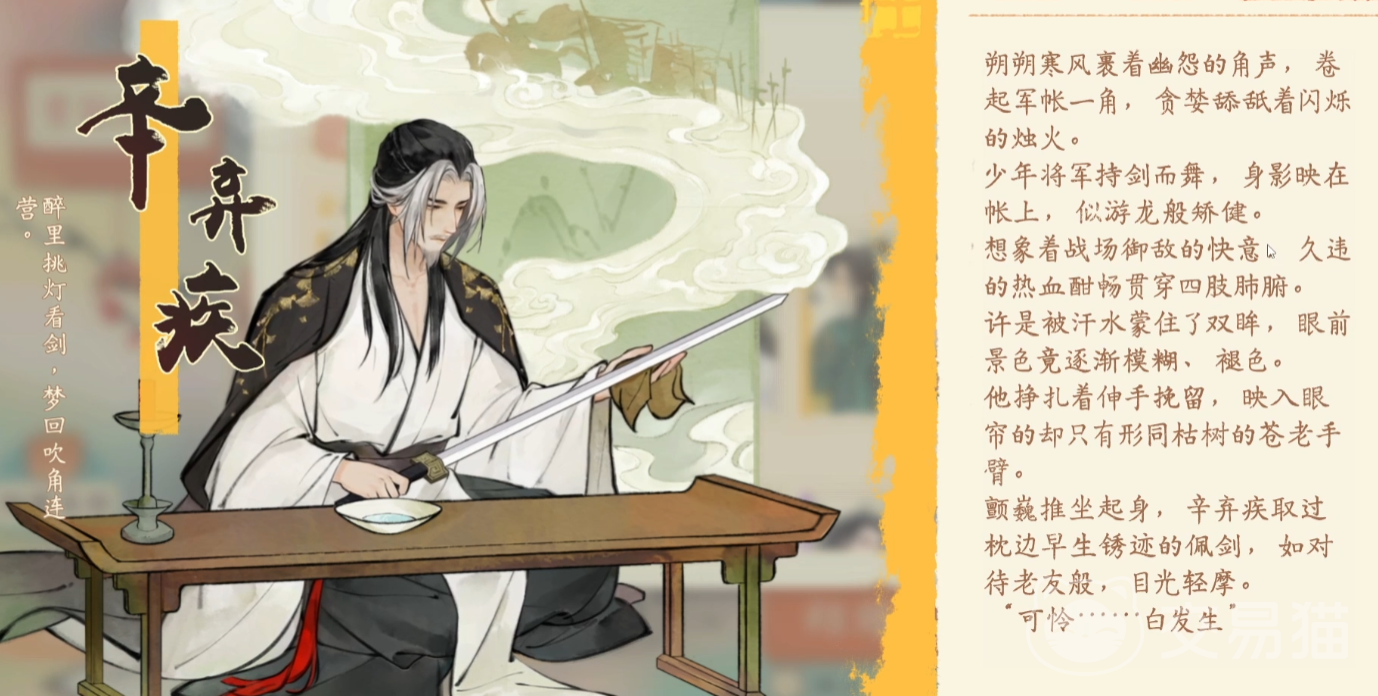 第二位是辛弃疾,他是一位比较擅长写作军事类题材的诗人,辛弃疾在游戏中适用于棉麻、锦织和工艺类的生产,并且在建造工业类的建筑时,有概率可以立即建造完成,这个概率与名士的等级挂钩,如果是在巴蜀小镇的话,建造的原材料还可以返回一部分哦。
