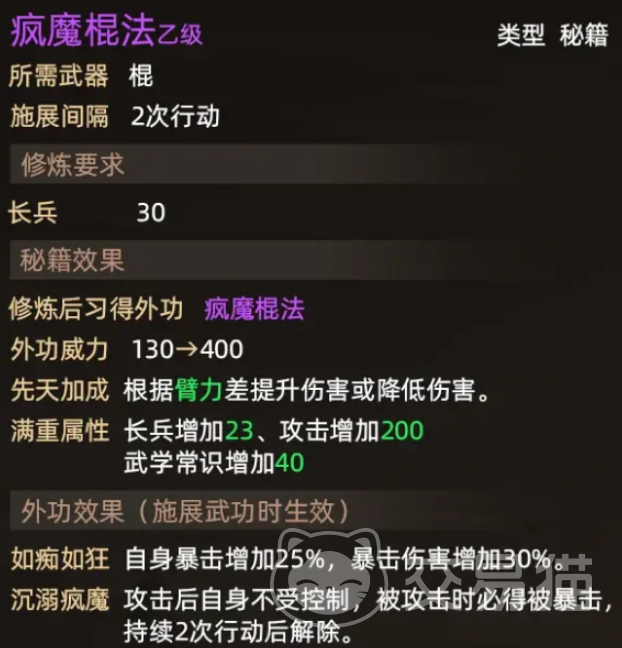 首先疯魔棍法作为一本紫色武功秘籍,使用之后可以让你提升两次伤害。可以有效地增加你的攻击伤害,若是佩戴长兵器的话,那么伤害还会进一步提升。此外也能提升自身的暴击率,并大幅增加你的暴击伤害。若是施展相应的外功,还会带来额外的特殊能力以及效果。
