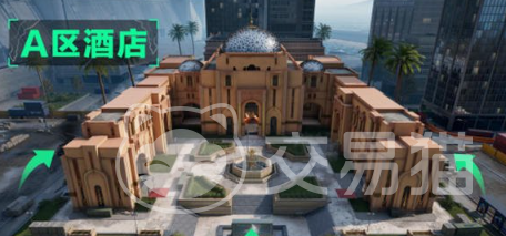 那么来认识这三个点位,首先要带大家认识的是这三个点位中的第一个a点位,该点位位于地图最中间位置,大家从出生点出来后就能在正前方看到这个点位,在看到该点位后,大家会看到这点位中有酒店建筑,这酒店非常的大,且大部分区域都为室内,这也就是说,在该点位中大家需要进行室内战,而说到这室内战,大家想要玩转的话,就需要了解室内的几个进出入口。