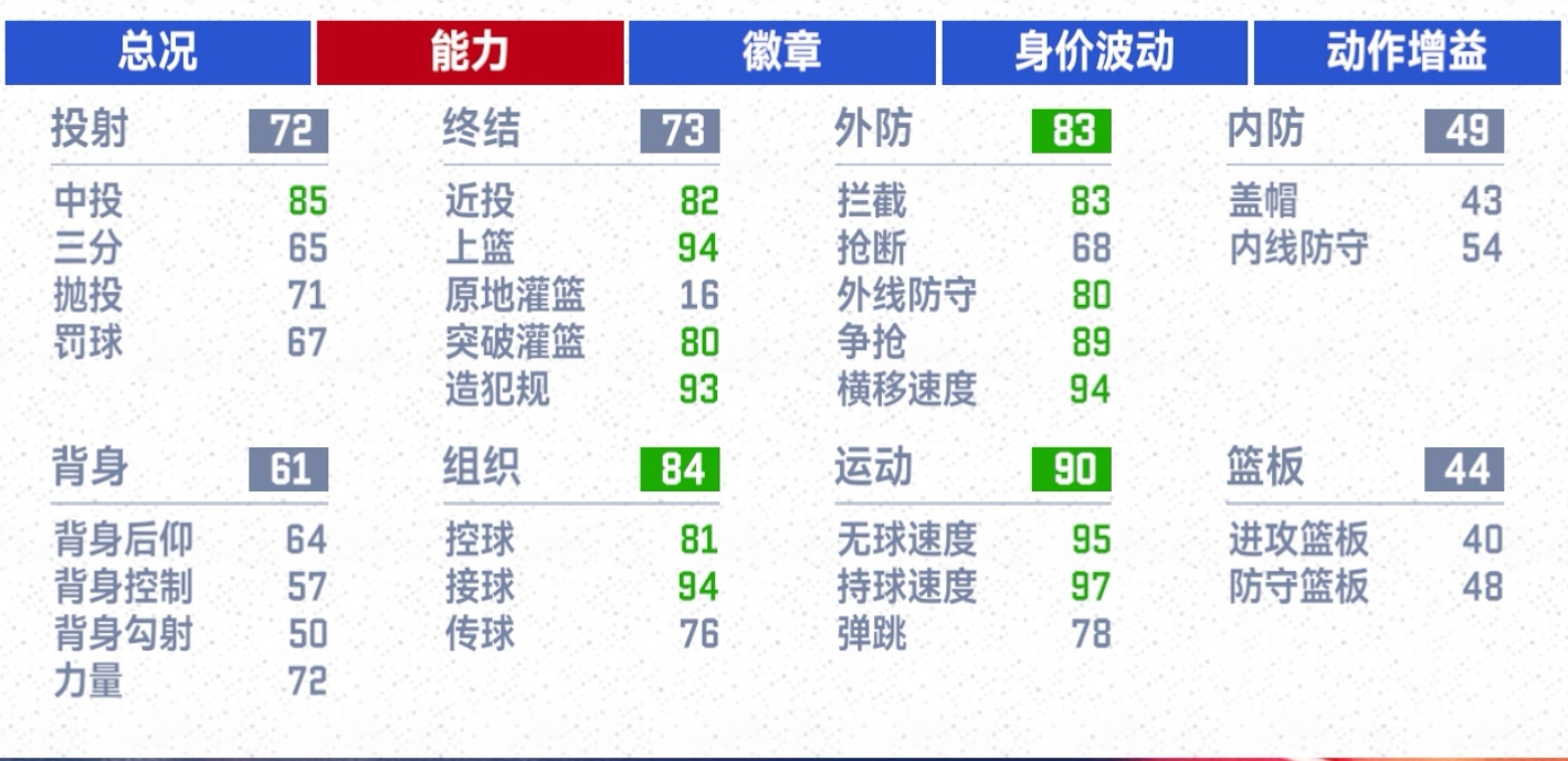 游戏中韦德的投射能力比较弱,就算最好的中投也只有85分,所以在实战中,除非机会十分好,大家不要轻易出手,可以利用它出色的外放、组织和运动能力,去为球队抢下球权完成转换并创造更多的机会。