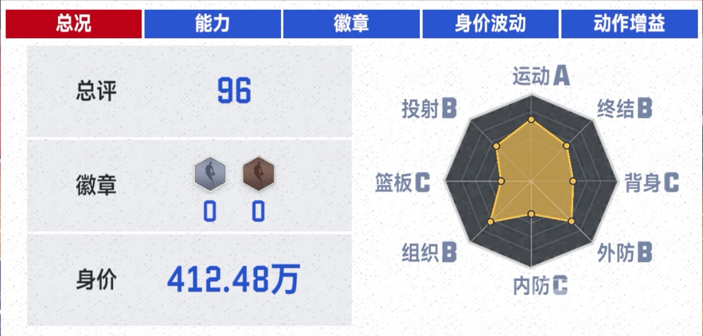 游戏中把球员分成了多个品质,其中紫色是最为稀有的,抽中的概率不算太高,韦德就是一种紫卡,总评达到了96分,各项属性的数值都很均衡,运动能力是它的强项,大家要是抽不到的话,那么也可以到转会市场内碰碰运气,花费一些支票就能将其招入麾下了。