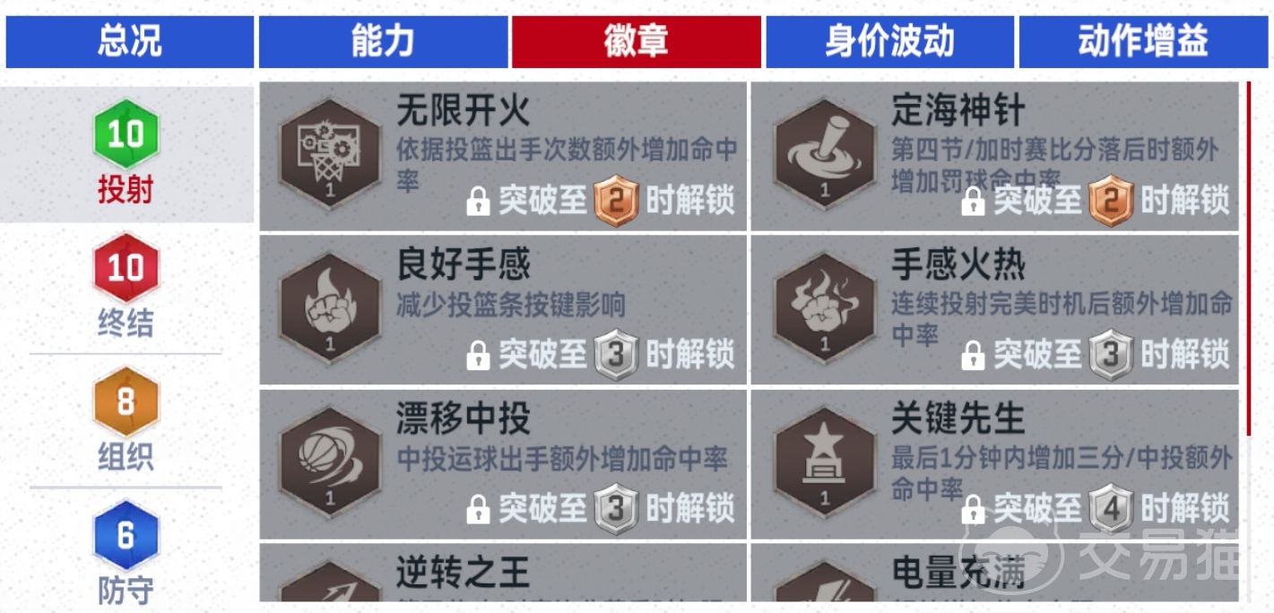 卡牌的原始状态下,是没有徽章的,随着后期阶数的上升,你会拥有更多的新徽章,届时就能使球员变强,这个球员的徽章分配比较平衡,突破到二阶时才能获得新徽章。