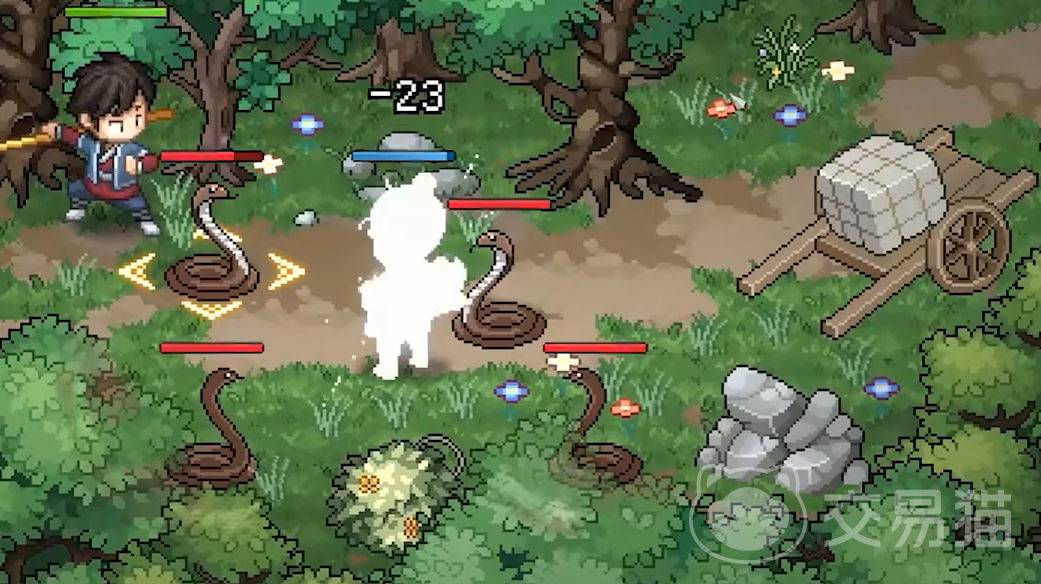 我们在往左上角走的时候有一个樵夫的事件,这个触发比较隐蔽,玩家们可以多探索一下。在触发之后我们需要帮助樵夫击退毒蛇。毒蛇总共有四只,玩家们尽量让它们集中起来使用技能对敌。