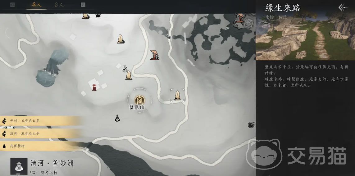 燕云十六声睡道人是一个奇怪的Boss,说他奇怪是因为他可能是参考八仙过海中的张果老设计出来的角色,像是一个仙风道骨的老道手拿拂尘、倒骑毛驴。那么燕云十六声睡道人位置在哪里呢?打开地图后找到清河的善妙洲一带,放大之后找到璧泉山,睡道人的位置就在那个“山”字附近。