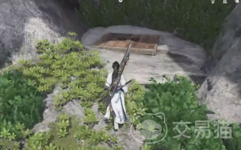 跳下后发现武侠小说中说的都是真的,果然跳下悬崖都不会死,这里也是跳下后直接掉在崖边一个突出的部分。然后往回走,可以看到中间一部分陷入山崖之内,地面石头上似乎还盖着一块木板,去查看一下吧。