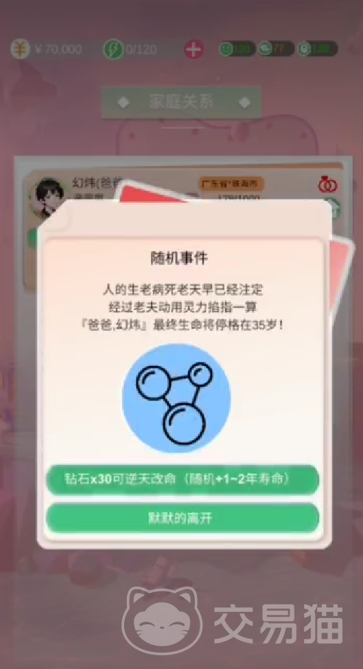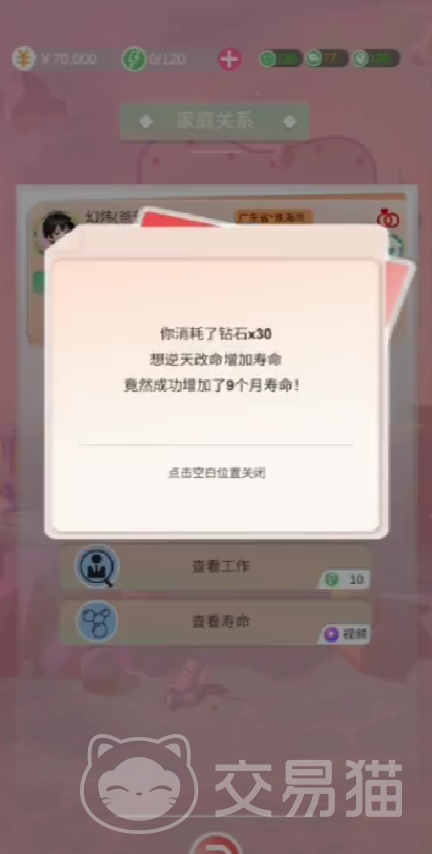 在游戏中,玩家初次养成的角色,可以让他不断地做好事,例如帮助老奶奶过马路或者是给福利机构捐款等等,当他的福报和功德达到了一定水准时,其最高的寿命可以到达七十,但是建议玩家此时并不要立刻使用掉这些功德和积累的资源,可以将这些资源留给下一代,让第三代以后继续继承功德和福报这样更容易修成仙体,游戏中也可以直接查看玩家的基础寿命,在查看寿命的面板之中,玩家还可以通过消耗钻石或钱财来获得更多的寿命。