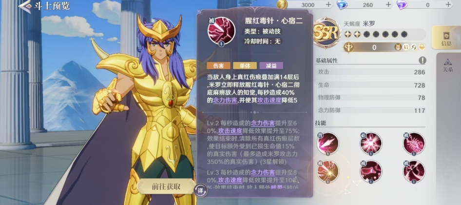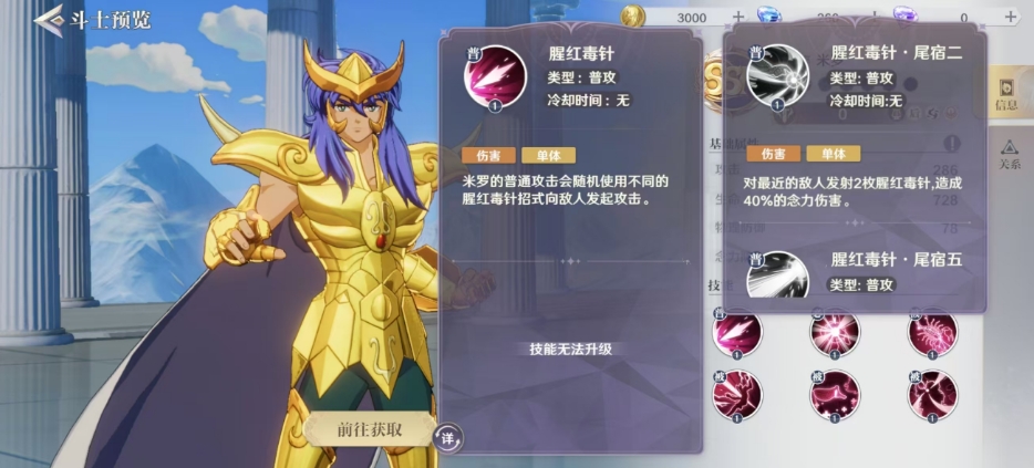 天蝎座米罗,作为游戏中的SSR角色,有着精湛的毒针技能和强大的单体伤害能力,他不仅能够通过腥红毒针对敌人造成大量伤害,还能利用真红伤痕对敌人进行持续的伤害和减益效果,是队伍中不可或缺的输出与控制同步进行的角色。米罗的普攻腥红毒针会随机使用不同的招式向敌人发起攻击,而当叠加至腥红毒针·尾宿二后,他能够对最近的敌人发射2枚毒针,造成高达40%的念力伤害,这种攻击方式不仅伤害高,而且前期是比较好的普攻效果,对比其他角色的普攻来说优势是很明显的。