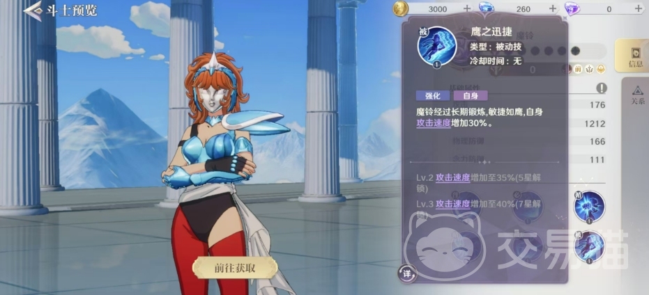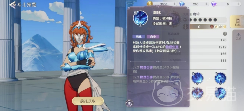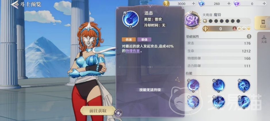 另一个被动技鹰之迅捷则能够增加魔铃的攻击速度,使她的攻击更加迅猛,这个技能的效果也随着星级的提升而增强,最高可将攻击速度增加至40%,最高的时候攻击速度会增加至40%,这个百分比的效果会在角色7星的时候解锁。