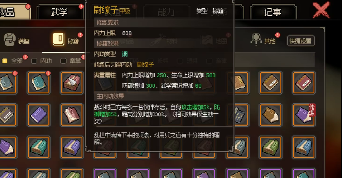 以上内容就是本期小编给大家带来的大侠立志传尉缭子获得攻略的全部内容了,作为一本辅助内功,它能够增加玩家在战斗中的基础存活率,无论是前期还是后期都有着比较好的作用,希望看完本期内容的小伙伴们可以实际进入到游戏内体验一下哦。