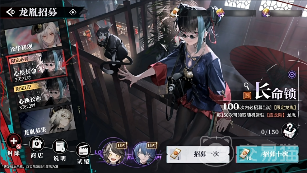 2、必得卡池:卡池只要有限定角色,就会出现两个卡池,其中一个就是限定必得的,这个可以在100次内必得当期的角色,也就是百分百不会歪,并且150次还可以领取一个额外的随机常驻应龙阶。简单来说就是玩家只有有300抽,那么就可以直接获得三个限定角色加上两个超级角色了。平均下来就是六十抽获得1金,总体来说还是非常不错的。