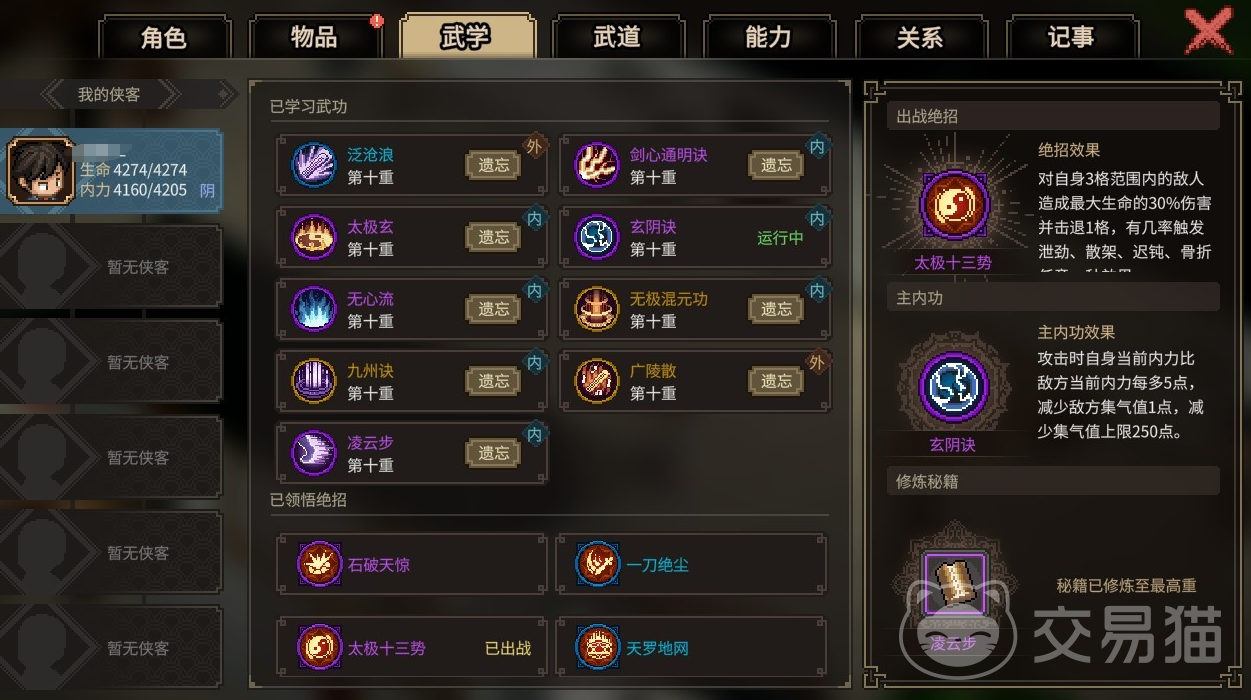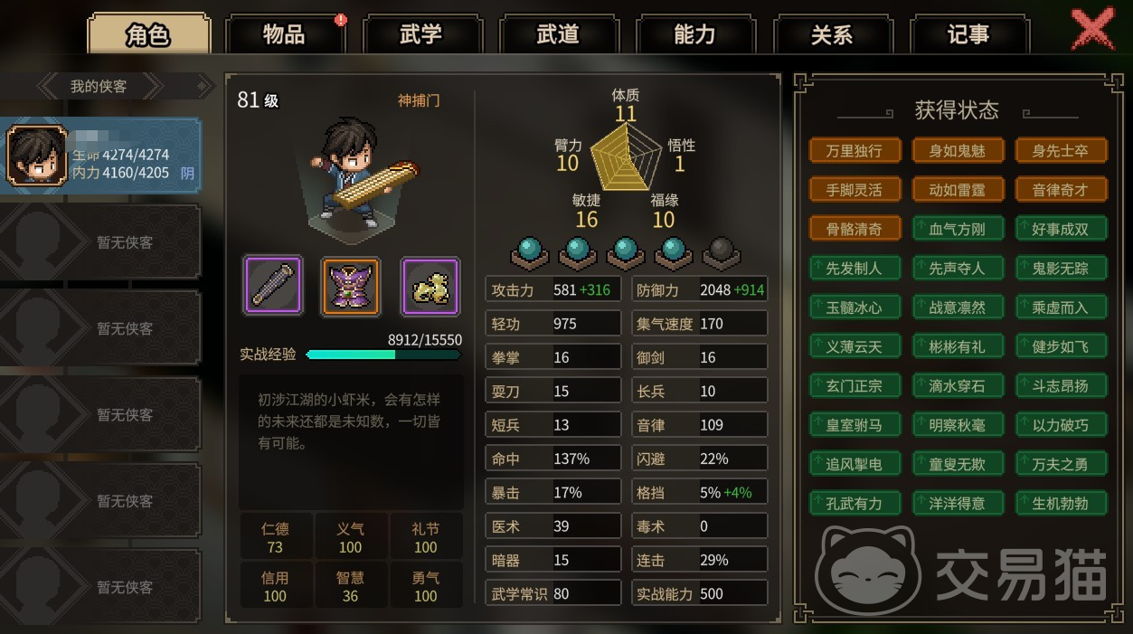 然后在五维的属性点上推荐大家点悟性,并维持在一点。这样即可大幅提升你的内力值,然后一开始即可学习紫色内功。若是在十里坡剧情上的话,则可吃一枚丹药,有效提升你的敏捷。至于其他属性的话,到了后期全拉到10点即可。