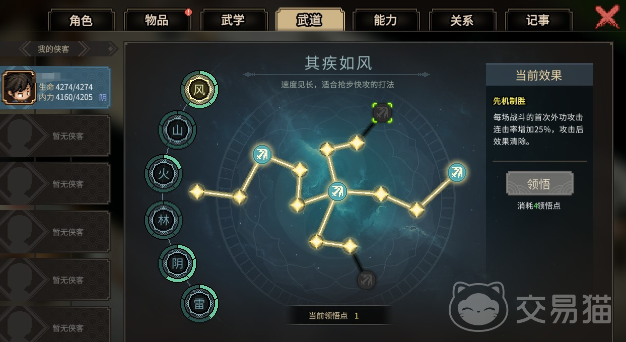 至于功法方面的话,更推荐大家使用其疾如风,使用后即可增加你的连击率。当然攻击完成后就会清楚,会大幅度提升你的输出效率。然后还可学习侵略如火,使用后就能触发暴击率,让你造成高额爆发伤害,使敌人重创。