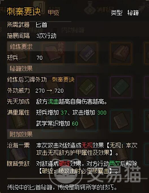 刺秦要诀是专门对匕首进行加成的超强功法,能让短兵属性提升37点的同时增加300点攻击力,同时当使用匕首对处于流血状态的敌人造成伤害时会根据对手流血的层数提升伤害,这个外功最重要的一点就是可以无视敌人的护甲属性及效果,相当于大家面板攻击属性是多少就能给对手造成多少伤害,而且还会给敌人造成破绽效果,处于破绽状态的对手被攻击时必定触发暴击,这两个效果一叠加,打boss直接就能表演一波血条消失术,非常给力。