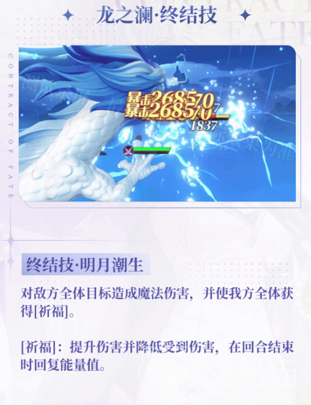 至于她的大招叫做明月潮生,能让她化身为水龙王。并控制世界中所有的水源,然后源源不断地朝着敌人翻涌而去。最终造成高额的魔法伤害,爆发性极强。另外还可以协助所有的队友获得祈福效果,在祈福的期间能增加所有人的伤害。并减少敌人对我方的输出伤害,此消彼长之下能获得的增幅自然巨大。结束回合后,还可以恢复所有人的能量值。
