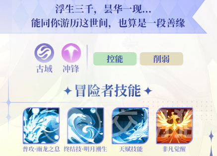 她的普通攻击叫做雨龙之息,通过雨滴对敌人造成伤害。天赋技能则可让她不断的恢复能量,如此就能更快地用出主动技能。三技能的话就可以让她觉醒能力,让她的攻击可以对敌人造成击退效果。带有一定的控制能力,并有效增强伤害。