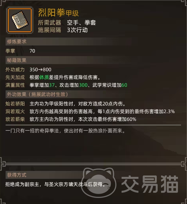 烈阳拳既可以空手释放,也可以带着拳套打出来,每三回合可以释放一次,它的先天加成是和敌人的体质差越大对敌人造成的伤害就越高,当它施展的时候,如果携带者带的是阳性甲级内功,可以对敌人施加20点的内伤,而敌人每有一点内伤,携带者攻击他时就会有2.3%的最终伤害,同时如果敌人主内功正好是阴性的话还会再提升60%的伤害,面板属性非常高,在前面几个周目获取到它的话打boss会轻松很多。