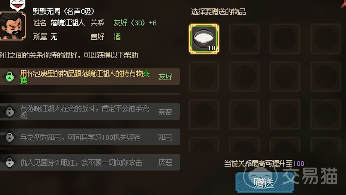 之后我们需要先去茶博士那里买一些粗茶,这些马上可以用到,玩家们可以多买点,但也要给自己留一些铜币才行。接着我们来到左下角给大哥进行送礼,送到60之后便可以向其请教机关之术,这点事前期必须要学习的。