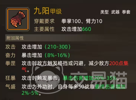 在这款游戏中,玩家能够去解锁很多不同的功法以及武器,像大侠立志传九阳就是其中之一,作为甲级的拳套,它直接就能为大家带来660的攻击力加成,在实用性效果方面表现还是十分不错的,因此得到了许多玩家的追捧和喜爱,大家对于此有想法的话,那么就一起来接着往下看看吧。