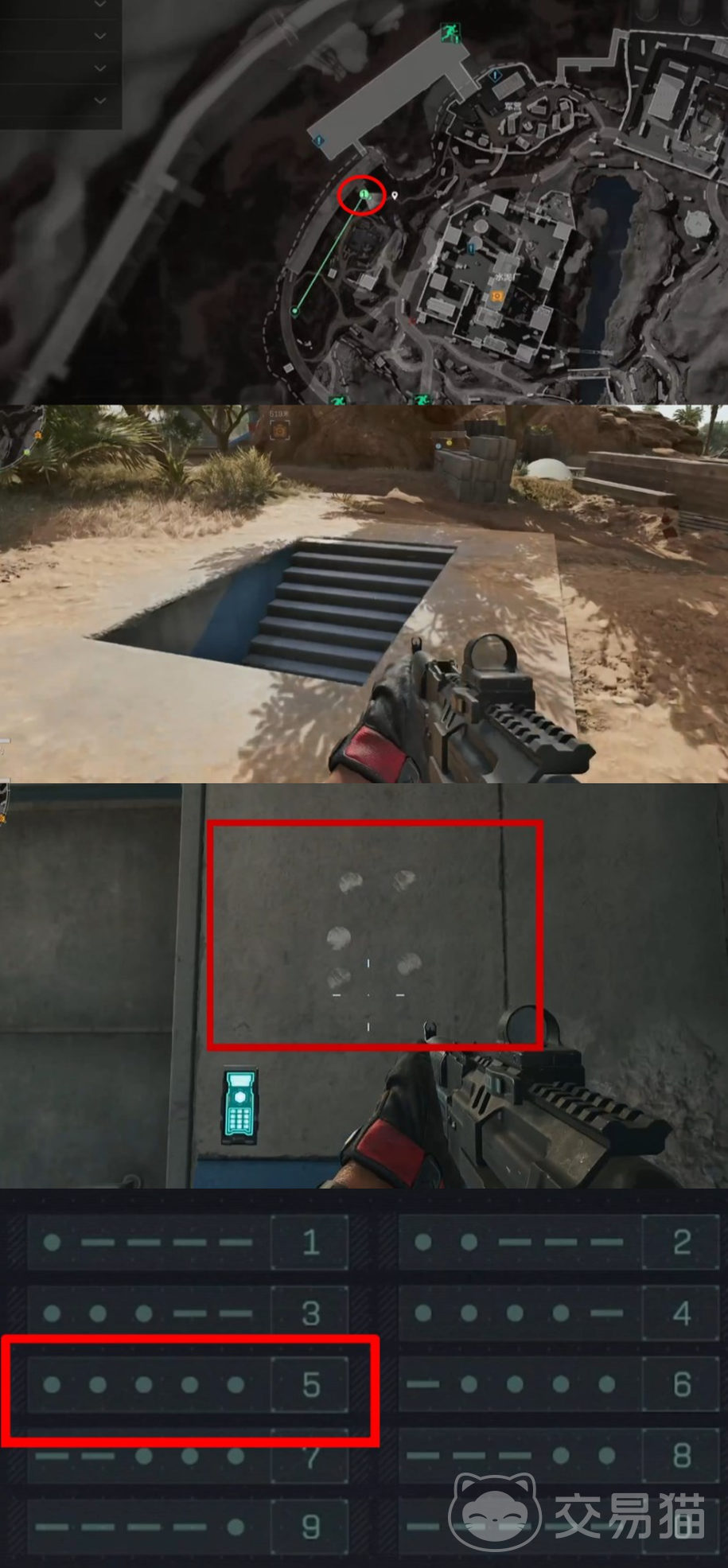 首先来到如图所示的地图标点位置,可以看到有出楼梯通往地窖,在地窖的墙上会有几个白色点,根据摩斯密码对照表了解到这就是5的意思。