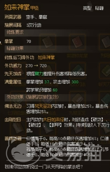 当你的佛法感悟达到一定高度后,便可前往寺内的四块石碑雕刻前参悟。每块石碑都蕴含着深邃的佛法与掌法技巧,唯有真正参透者才能获得提升。在参悟四块石碑后,玩家将会触发系列挑战,进行四场严苛的战斗。只有在这些战斗中胜出,并且拳掌技能达到50以上,方能最终获得“如来神掌”这一绝世武学。