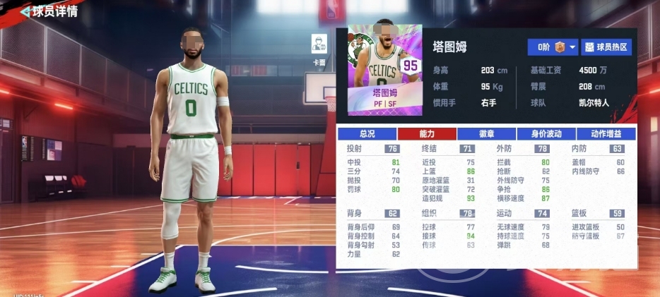 他的罚球同样出色,基础数值达到80,上篮方面,他拥有88的基础数值,而在获得徽章提升后,这一能力将变得更加强大,造犯规是塔图姆的强项,他在这一方面的基础数值高达93,几乎是游戏中的顶级水平,同样出色的还有他的接球能力,94的基础数值几乎可以保证任何传球他都能够顺利接住,这些技术和身体上的优势使得塔图姆在游戏中成为了一个不可多得的全能球员。