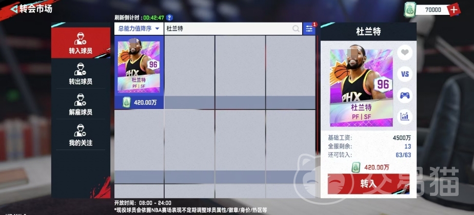 最后为大家推荐杜兰特,他属于一个大前锋,他所拥有的233cm惊人臂展,不仅是他的身体特征,更是他在篮球赛场上攻守兼备的巨大优势,杜兰特的综合评分高达96分,在基础属性方面,他的造犯规能力达到了92分的高分,这一数据充分体现了他在比赛中制造对手犯规、为球队赢得罚球机会的能力,同时他的接球属性也达到了94分,这一属性的高分显示了他在接到球后能够迅速且有效地转化为进攻动作。