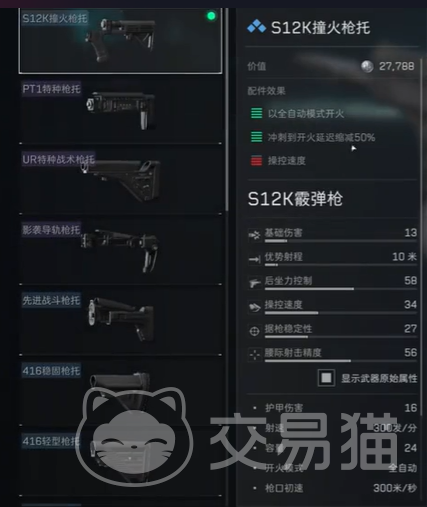 在S12K的改装上,首先要解决的就是稳定性问题。选枪托时,撞火枪托可以说是最好的,因为它能够减少后坐力,避免连续开枪时手指发麻。如果不选撞火枪托,S12K的后坐力会让你在快速连发时感受到相当大的压力,影响命中率。通过撞火枪托,你能够保持持续的火力输出,而不必担心射速过快而导致手感失控。
