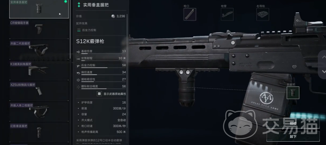 S12K改枪时,握把的选择同样关键。垂直握把在提升稳定性方面表现得非常出色,尤其适合这种连发速度较快的霰弹枪。它能够有效减少枪口上跳,让你在连发时依旧能够保持枪口的稳定,不至于一顿扫射后全都打在天花板上。垂直握把的作用非常明显,能让你在面对敌人时更加沉着自如地应对,保证每发子弹都打到该打的地方。