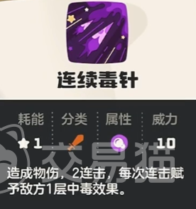 影狸的二技能叫做连续毒针,可以对敌人直接造成二连击,并且每一次连击都能够让敌人增加一层中毒效果,同时对敌人造成物理伤害。二技能在实战中发挥的用处更大,并且和影狸的特性非常适合,大家可以将其作为首选。