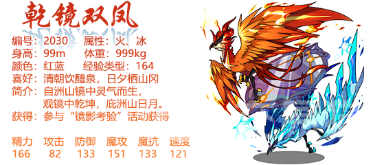 乾镜双凤这一角色是可以在影考验的活动中获得的,它的属性比较特殊,同时拥有火和冰的双属性,所以取名为双凤,因为这一特殊的属性,所以乾镜双凤的形象也采用的是红蓝两色的搭配。