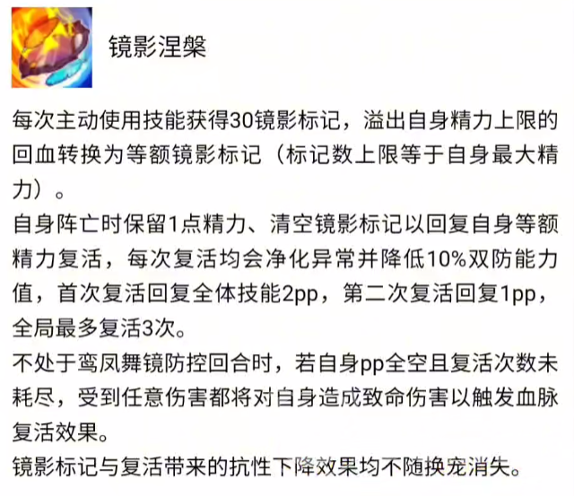 乾镜双凤的微凤一羽技能还可以利用战场中已阵亡的宠物来提高自身的伤害,同时还可以恢复其他伙伴的精力。另外镜影涅槃这一技能在战局中可以复活三次,也是乾镜双凤最无解的技能了,大家要巧妙的利用。
