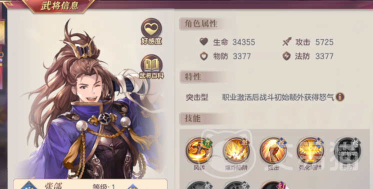 张郃这是不少玩家都想要得到的武将,各方面的属性都很不错,生命值达到34,355,攻击数值为5725,物理防御为3377,拥有突击型的特性职业,一旦在激活之后就可以额外获得怒气。另外还有多个不同的技能,而这些技能分别是风转、爆炸陷阱、强击、利刃,对玩家而言,在获得这一个角色之后,实力比较出色。