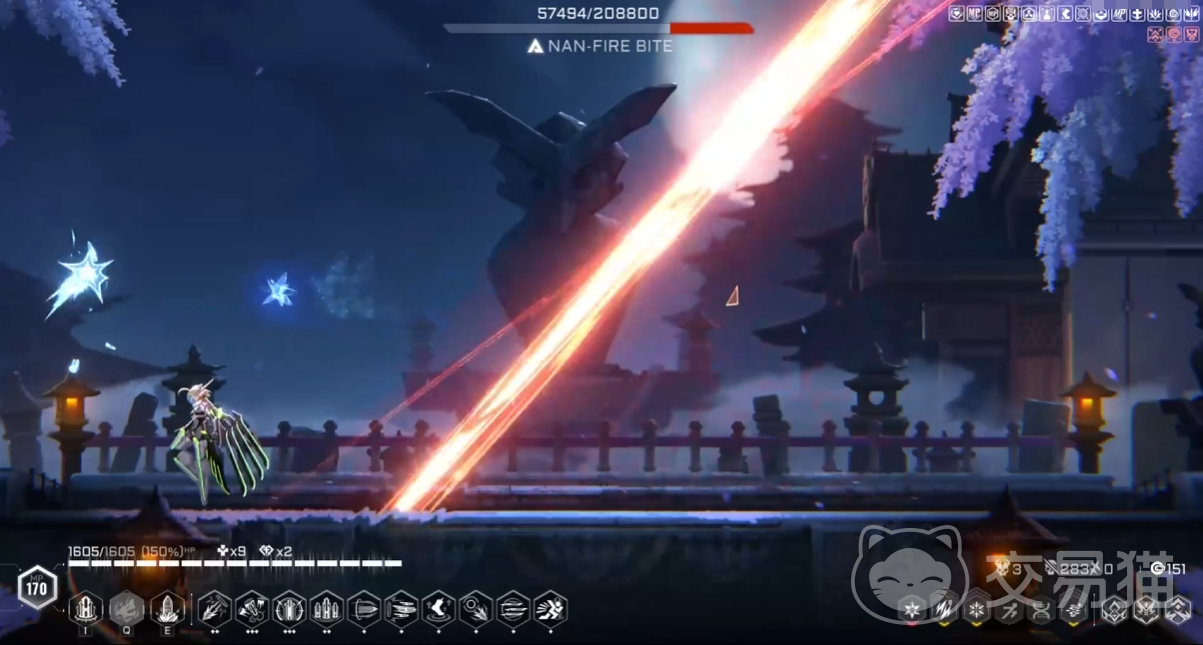 4、旋风斩:常用技能之一,攻击分为了横斜两种攻击方式。横着是后退一步,转动武器向玩家进行攻击。斜着的则是原地蓄力,然后向斜上方位移,之后进行攻击。横着攻击的攻击范围非常大,即使闪避过后仍在其攻击范围,通畅来说需要二段跳滞空来进行躲避。斜着的攻击基本就没有什么难度了,斜着的攻击BOSS会在天上停留,玩家此时进行攻击即可。想要克制这个技能最好的方法,就是分辨她是怎样的攻击方式,通畅情况下都是很容易分辨出来的,大家多打两遍就能知道。