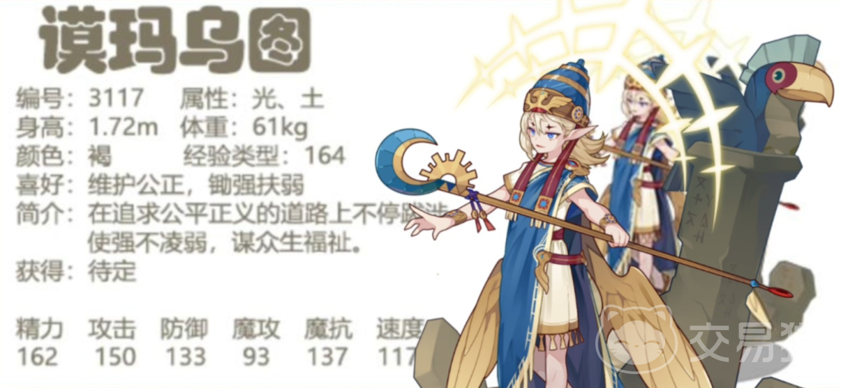 这是一个性格开朗却带有点小固执的角色,他手持着一柄末世法杖,身后还跟着一只法老鸟。作为古代埃及的遗留后代,留存千年的他早就积累了无上法力。作为光土双属性的法师角色,在追求极致公平的道路上没有停滞不前,平常喜欢锄强扶弱拔刀相助。