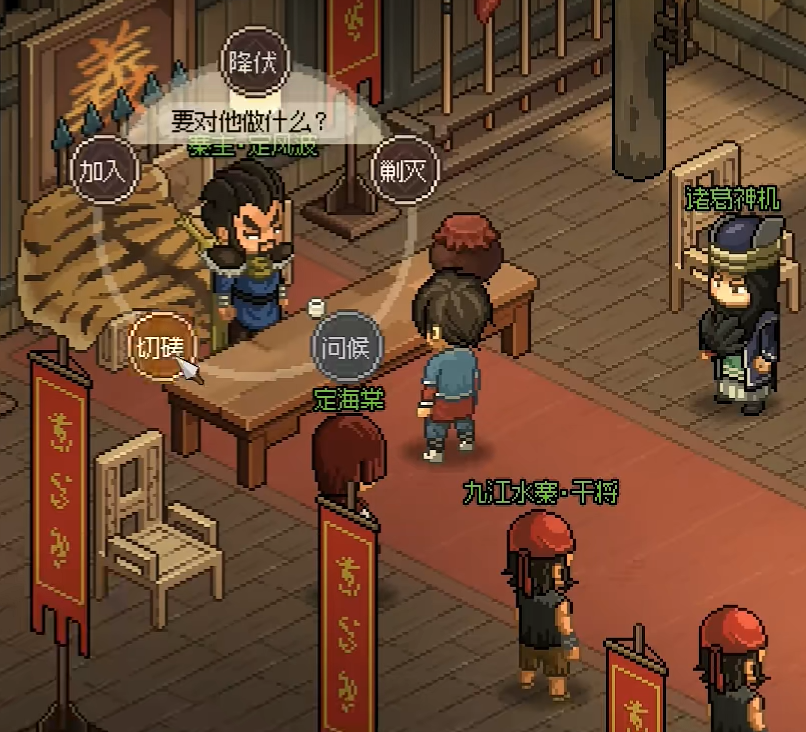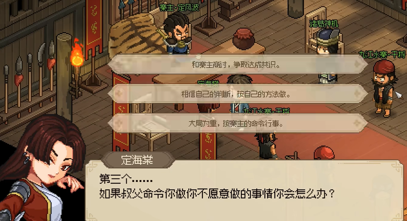 定海棠,玩家在加入后会对玩家进行两次考验,首先第一次是单挑,玩家们很容易就将其击败。第二次考验则是会要求我们回答一些问题,这些问题的答案玩家们可以以忠心为九江水寨来进行选择即可。之后我们和定海棠的关系会增加10点,九江水寨则是会增加2点。