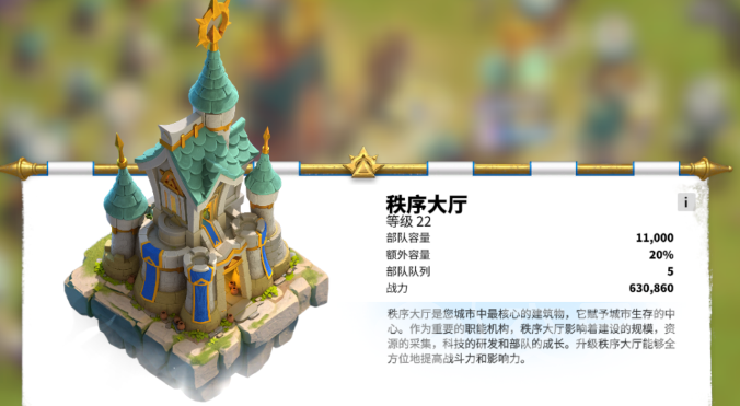 城市中的建筑需要进行升级,但由于我们资源有限的关系,肯定是需要做出取舍,建议新手玩家优先提升秩序大厅,秩序大厅可以说是整个城市的核心建筑,限制着其他建筑的等级上限、只要提升了才能训练更高等级的部队,研究更加强大的科技,大家可以先将资源全部给秩序大厅,争取到16级,因为前期大家能派出的队列十分有限,而且部队数量也少,只有到16级的时候才会解锁空中部队的训练建筑,和四只派遣队列,大大提升我们的实力;