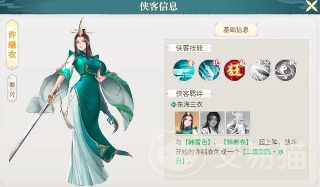 这个角色和韩雪色、鹤着衣一起上阵时,会在战斗开始时生成一个二级的剑阵水月,不仅能快速的提高队伍防御,还能增强自身的攻击,此外在和特定的侠客上阵时,许淄衣能触发特殊的羁绊效果,进一步提升整个队伍的战斗力,比如上面提到的韩雪色、鹤着衣,同时上阵就能激活“东海三衣”的特殊效果。