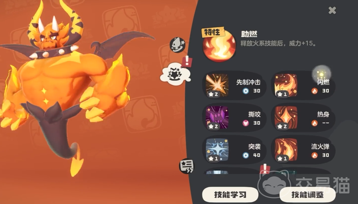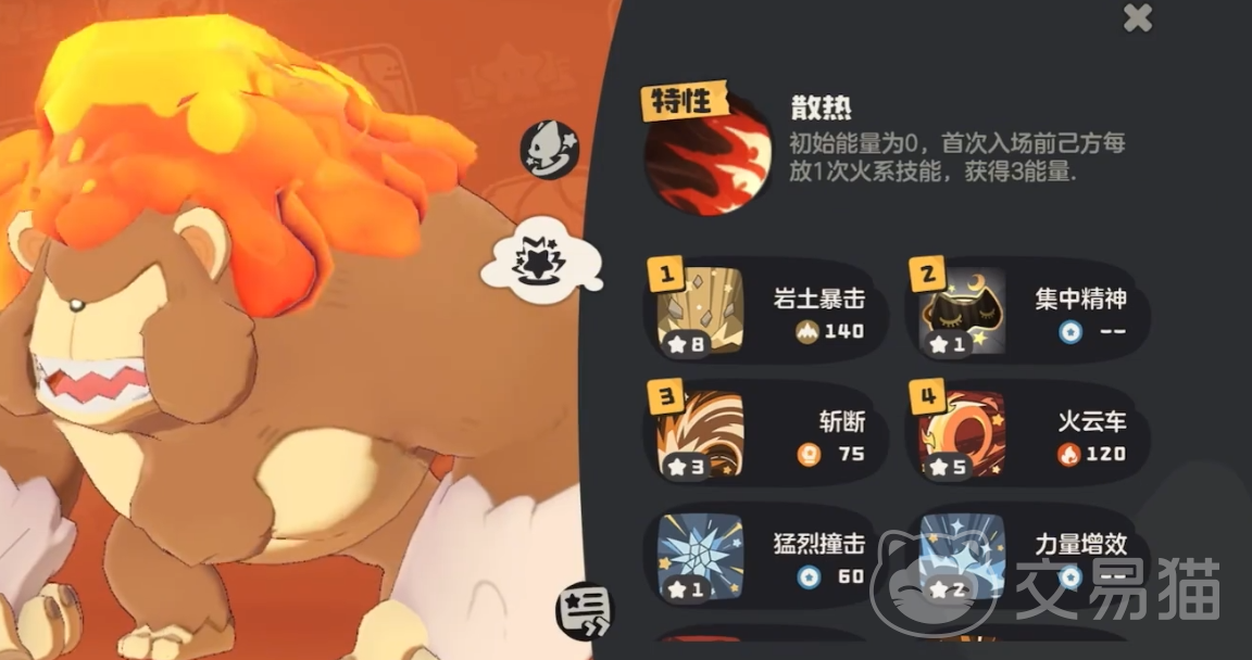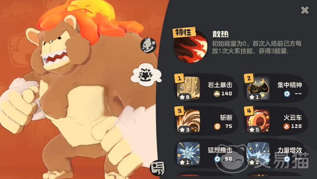 火焰猿的战斗力虽然很强,但是他的特性是一个比较棘手的缺陷,火焰猿初始的能量值是0点,也就是说如果他是第一个出场,那么他一个技能都放不出来,只有前面有精灵释放过火属性的技能他才会以技能数X3的倍率回复能量值,所以为了能让火焰猿放出更多强力的技能,就需要有至少两个能先手放技能的火属性精灵帮他叠加伤害,这样火焰猿再出场就能以满能量值的状态快速释放高能量高伤害的技能了。