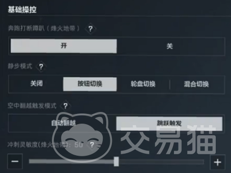 除了三指键位码,玩家也可以了解一下关于其他按键的功能。在枪战游戏中,最基础的就是关于跑步时和静步时模式的开启,一般玩家会在基础操控中打开奔跑打断蹲趴开关,这样的模式更利于玩家在战斗时进行一系列的动作。静步时模式的切换选择性较多,不仅有按钮切换和轮盘切换,玩家还可以选择混合切换达到同时可以选择。玩家还可以设置空中翻页触发模式的方式,一般会选择跳跃触发。