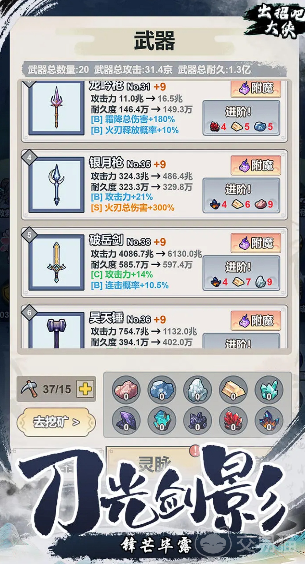 除了武功修炼外,装备也是提升实力的重要方面。而获取的话其实也很简单,毕竟是挂机游戏,所以只要大家挑战副本、参与活动打任务等等就能获取了,品质越高,属性加成越强大。玩家可以通过强化、进阶等方式提升装备属性,而附魔、进阶更能带来无穷的武器升级玩法。而且游戏还提供了装备镶嵌宝石的功能,玩家可以根据需要镶嵌不同属性的宝石,进一步提升装备效果,而宝石的话也是通过挂机玩法——挖矿获得的,大家只要耐心等待就能得到无数神级装备!