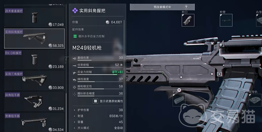 在配件中,小编首先为大家推荐的是稳定枪托和侧插弹匣,这两者的组合可以使得这把武器获得额外的后坐力加成,可以帮助小伙伴们在战斗时能够更加精准的瞄准对手。握把可以选择实用斜角握把,帮助玩家减少左右后坐力。在这样的改造之下,m249就将会被玩家们改造成一把超越步枪的轻机枪,无论是从后座力、秒杀还是射速方面,都是尖的。