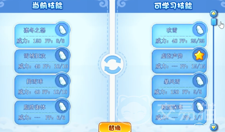他的技能大多偏向于冰雪招式,不仅威力强大,还有概率让对手冰冻。特别是虚张声乱,可让对手混乱,从而无法行动。后面的技能几乎都带有冰冻效果,而且还可以净化负面状态。到了30级后更是可以召唤冰雪风暴,直接冻住所有人。