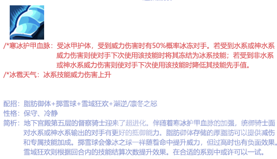 他的被动叫做冰甲,受到敌人伤害时有概率冻住对手。然后还能提升冰属性伤害,他的性格比较冷静保守。不会做出冲动的事情,跟他的技能差不多。都是一些偏防御或者控制的伤害能力,可以稳定消耗。